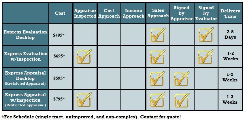 Express Evaluation (with or without inspection): This valuation report is our most popular option, applicable for limited scope assignments and loans under the de minimis (up to $1MM for ag properties). Rapid Valuations has an extensive comparable sales database, from which one of our highly trained data analysts, utilizing our proprietary appraisal software, can quickly generate an independent, top-quality, low-cost report satisfying interagency guidelines, when something less than an appraisal will suffice. An evaluation report closely mimics an express appraisal report; however, is not signed by an appraiser. An evaluation can be requested with or without a property inspection. We offer this product for vacant and minimally improved (50% or less) agricultural properties.